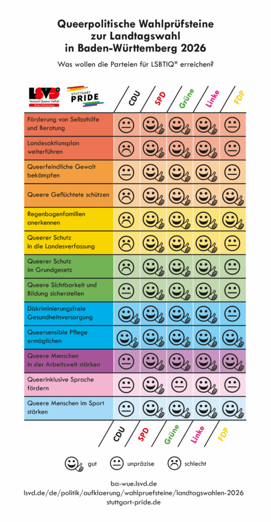 LSVD Wahlrprüfsteine: https://ba-wue.lsvd.de/2026/02/13/queerpolitische-wahlpruefsteine-zur-landtagswahl-2026/
